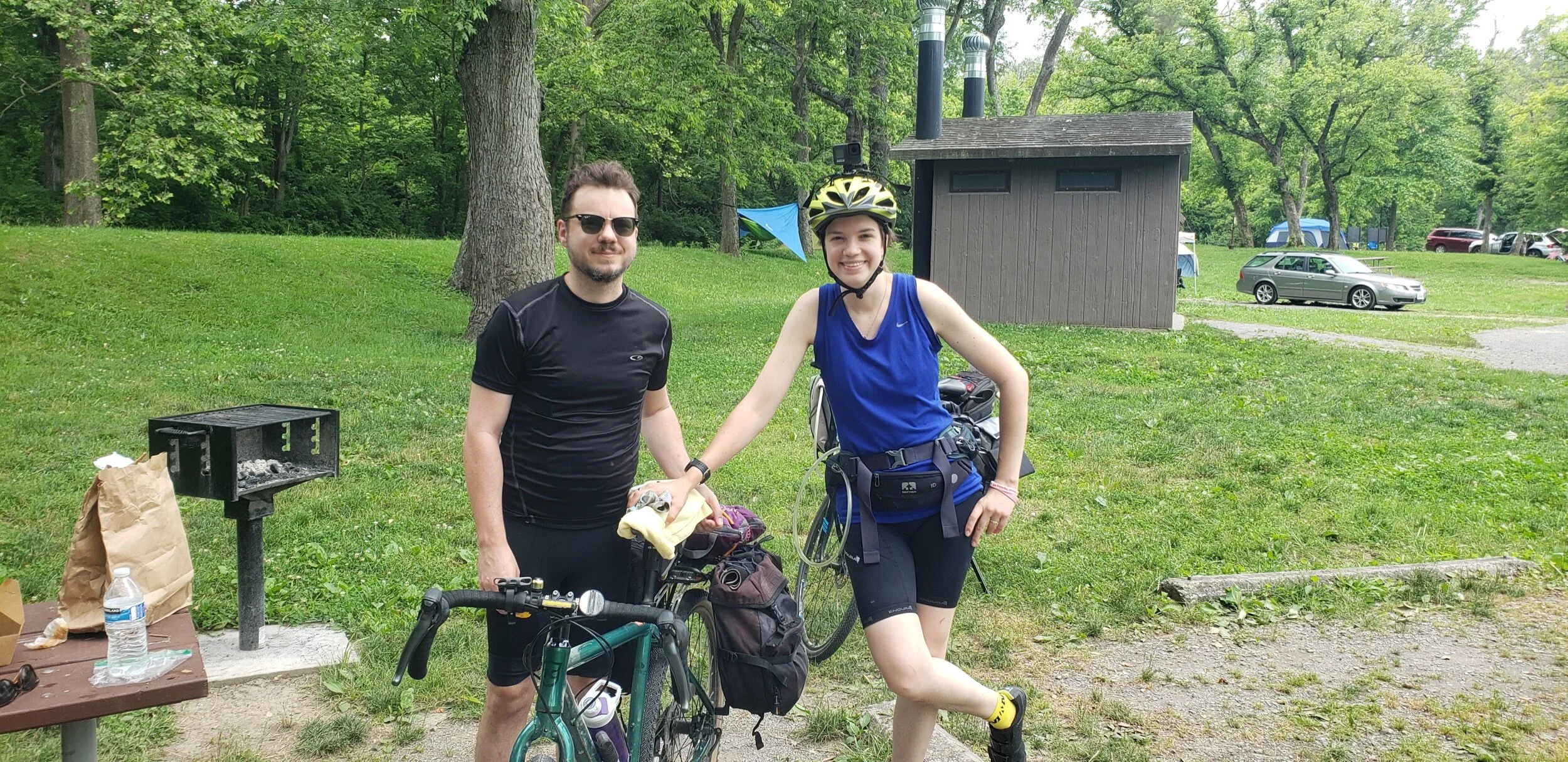 As usual, we set a good pace in the morning. Today’s 60 miles are a slow, steady incline and present slightly more rugged terrain than before. Marty falls once, passing Becca in the wipe-out tally. With the increased humidity we stop more frequently than our previous plan, trying to drink more water and ‘graze’ instead of stopping for longer meal breaks. We see our friend Kinton, who has camped outdoors for the night and is off to a slower start. A stranger at another campsite volunteers to take our photo. We must look like we’re in love or something.